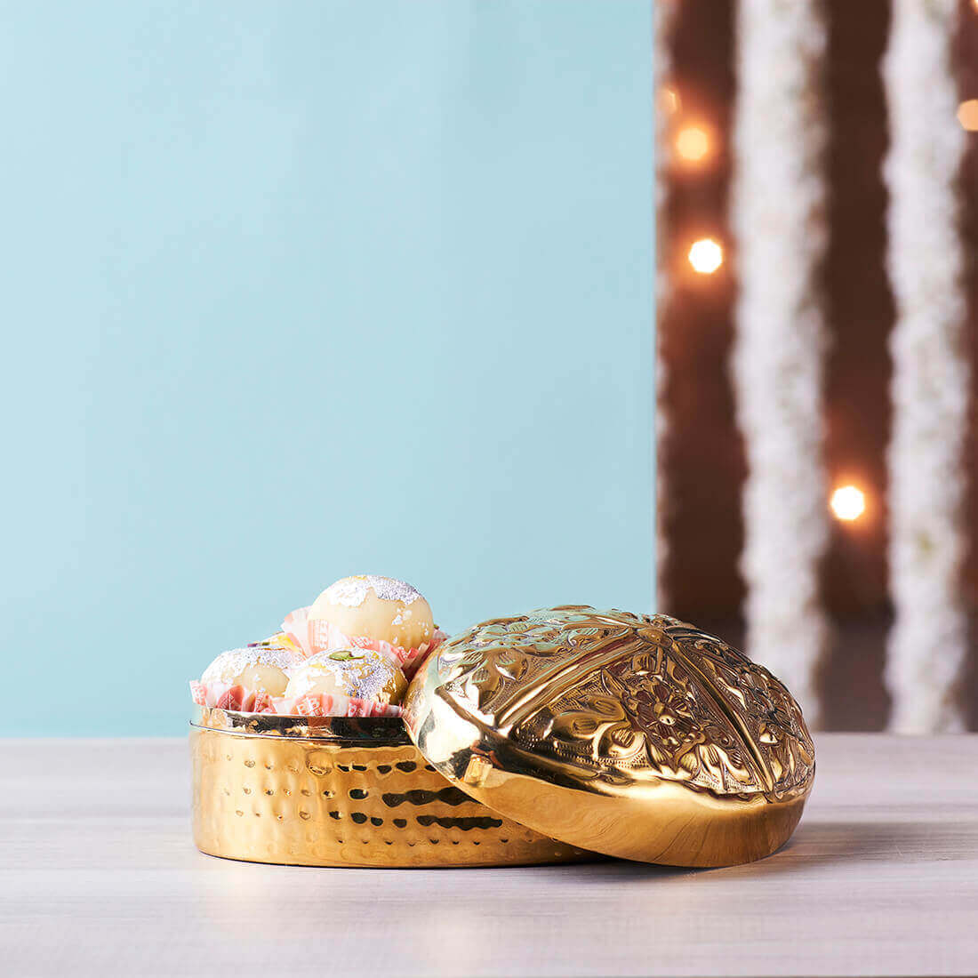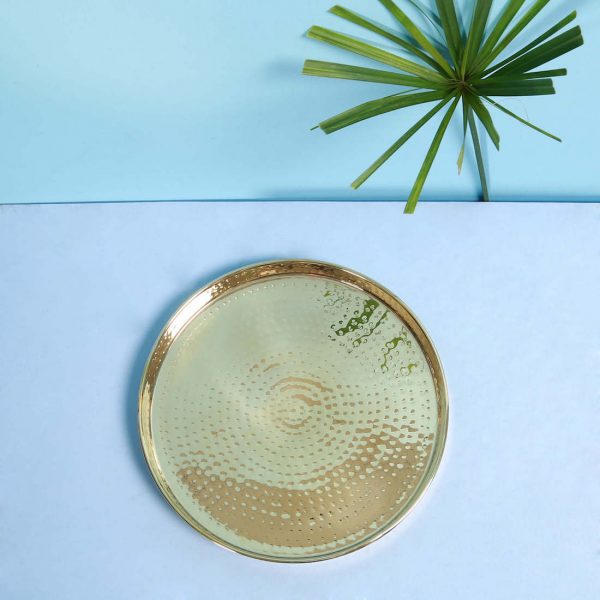 A beautiful handcrafted brass thaali with our favourite shimmy hammered pattern.